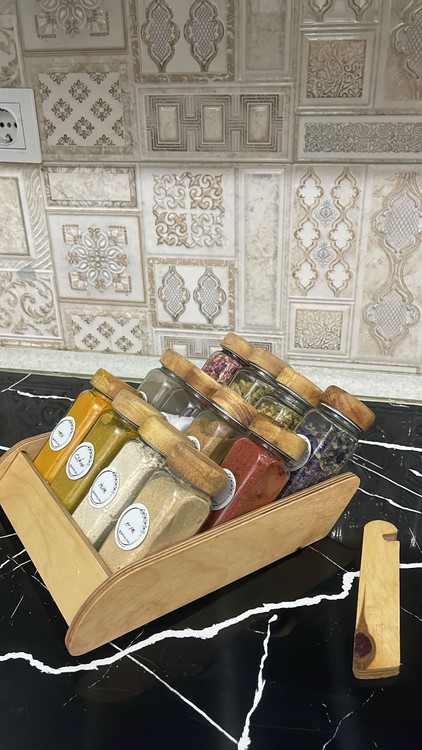 ۱۲ عدد شیشه ادویه ۱۲ سانتیمتری با درب چوبی – برای نگهداری انواع ادویه با ظاهری ساده و زیبا.