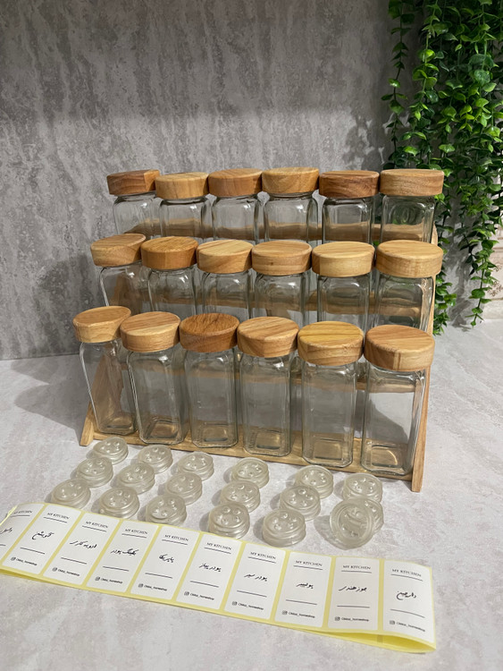 ۱۸عدد شیشه ادویه ۱۲ سانتیمتری با درب چوبی – طراحی ساده و لوکس برای نگهداری انواع ادویه.