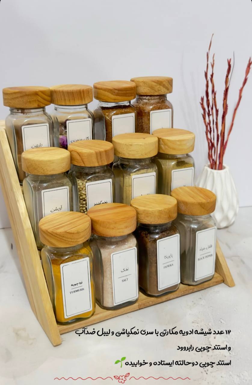 پک ۱۲تایی شیشه ادویه مکارتی درب چوبی همراه با استند چوبی دوحالته