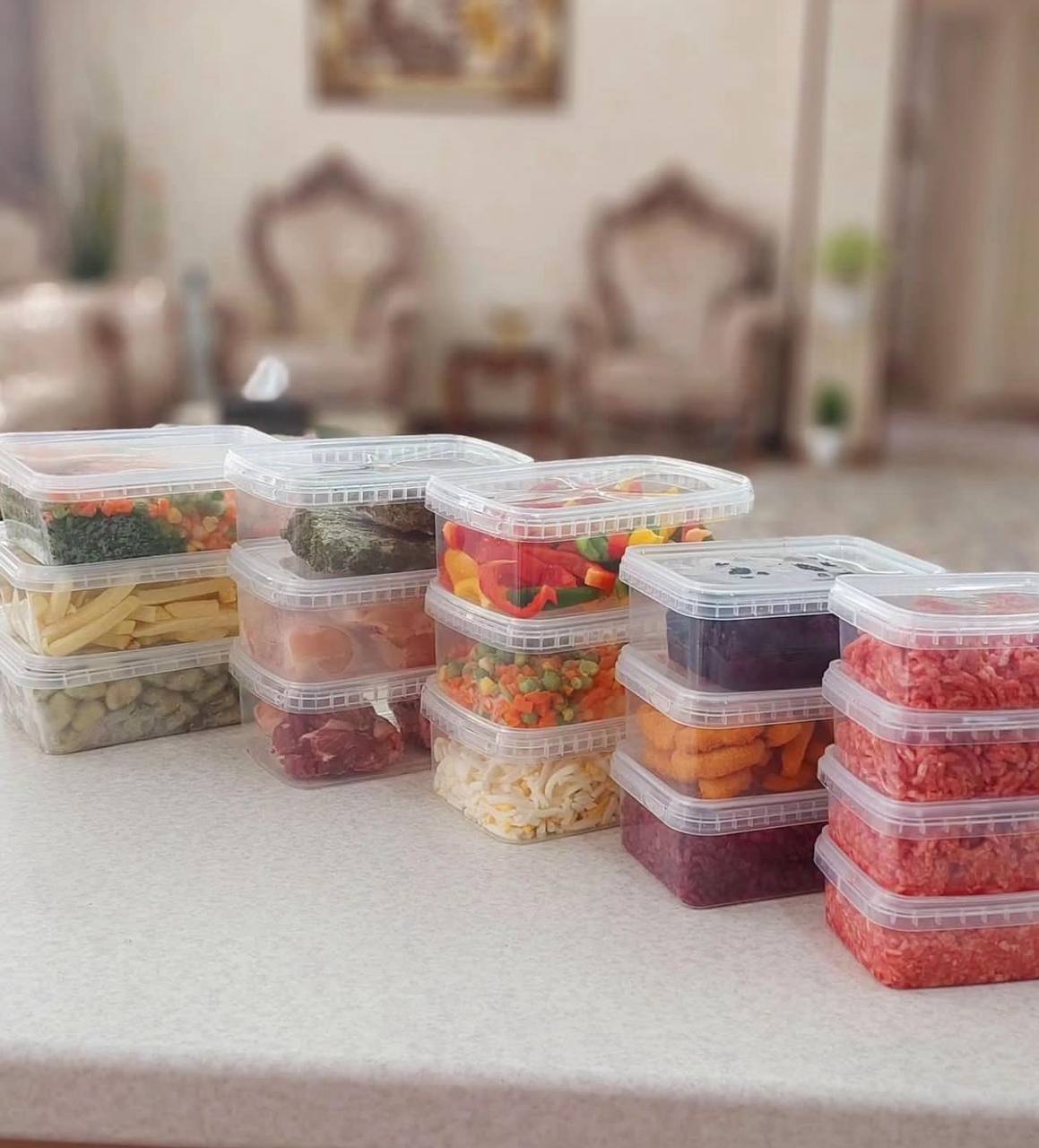 این ظروف از پلاستیک بهداشتی و مقاوم در برابر سرما و حرارت ساخته شدهاند و برای نگهداری، فریز کردن و گرم کردن مواد غذایی طراحی شدهاند — بدون تغییر رنگ، بو یا طعم غذا.